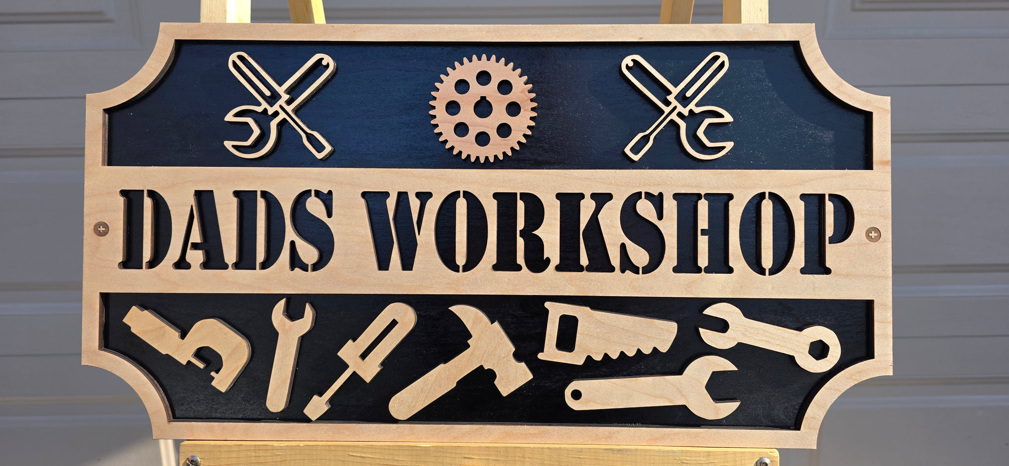 Dad's workshop sign. 11.5" x 22" sign laser cut from 1/4" maple. We can customize with name if desired. These items are make to order so please allow 7-14 days for items to ship.